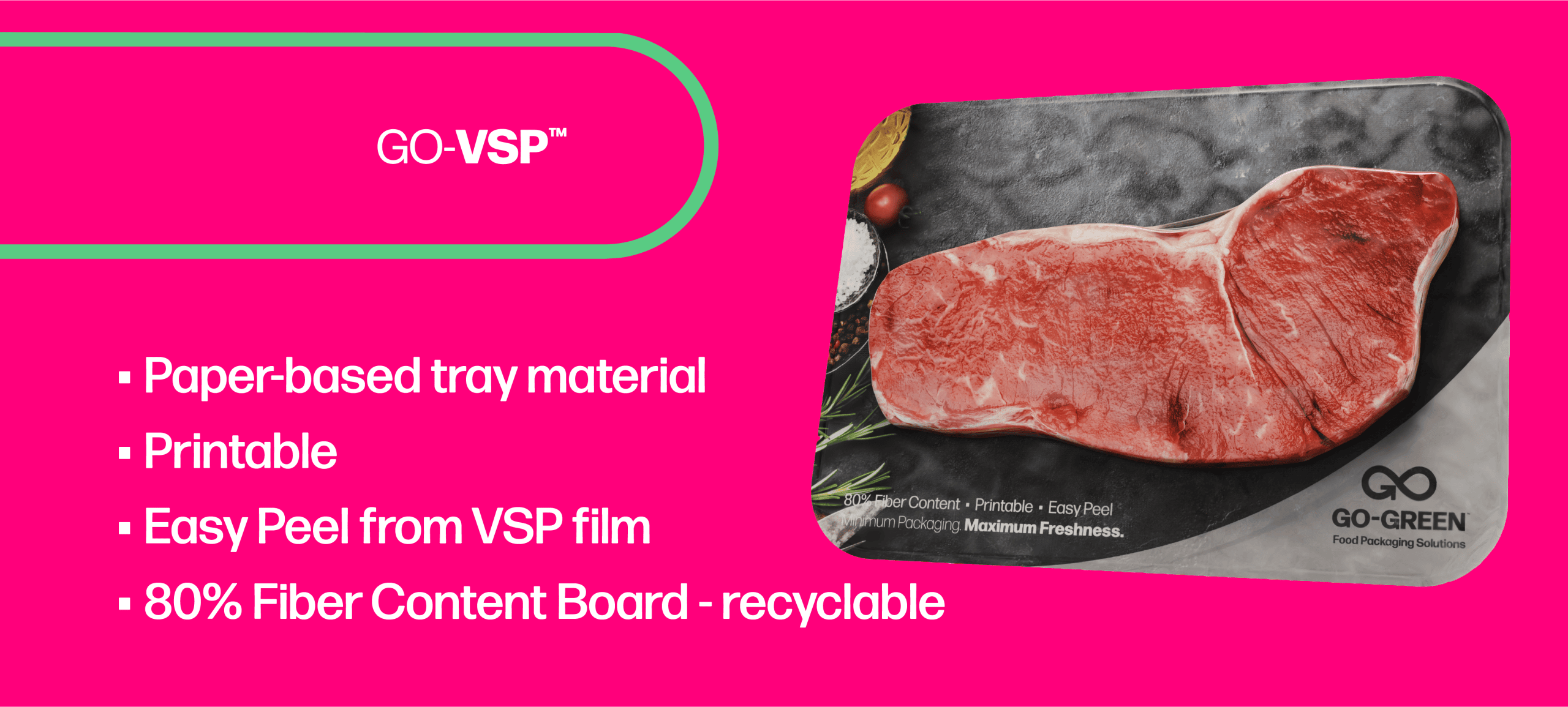 Go Polypro trays are used when the height of the product exceeds the depth of the tray in which it is packaged. This is an attractive sealing method for seafood, ready meals and other proteins. Meat and meat products continue their maturation process for enhanced tenderness, texture, and optimum taste due to the VSP process. Once opened the product is immediately exposed to oxygen and will only take a few minutes to bloom to its natural bright color, without altering taste and freshness. High safety standards and enhanced hygiene and preservation are a huge benefit of VSP reducing product shrink and food waste.